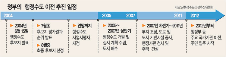 최종입지가 결정된 뒤에는 △내년 1월 토지 수용 △2006년 6월경 신행정수도 건설 실시 계획 수립 △2007년 7월 기반공사 착수 등의 일정이 이어진다. 아파트 분양은 2009년 상반기로 예정돼 있다.