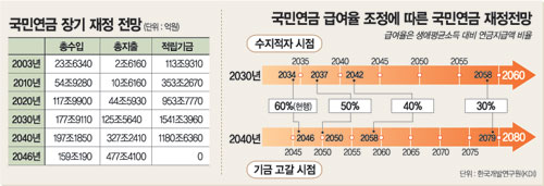 ▽시한폭탄이 된 연금재정=현행 국민연금제도를 근본적으로 뜯어고치지 않으면 현재 110조원을 넘어선 기금이 2046년에는 ‘0원’으로 완전히 바닥날 것으로 보고서는 전망했다.