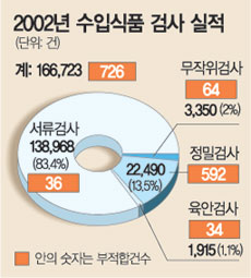 그러나 지난해 식약청이 시중에 유통되는 중국 식품 3244건을 임의로 조사한 결과 불합격률은 통관 때의 3배가 넘는 2.5%(83건)로 올라갔다. 수입될 때의 식품 검사가 얼마나 허술한지를 보여주는 증거. 식품안전 검사 체계에 커다란 구멍이 뚫려 있는 것이다.