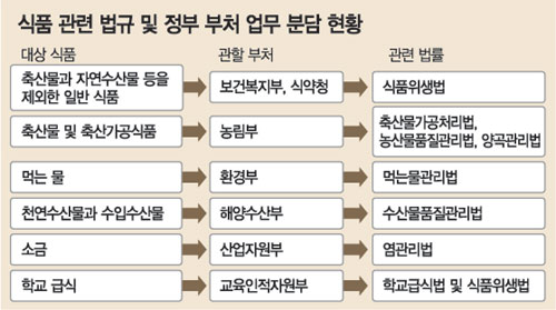 현재 식품 관련 업무는 보건복지부 식품의약품안전청 농림부 해양수산부 교육인적자원부 환경부 산업자원부 국세청 지방자치단체 등으로 분산돼 있다. 또 식품위생 및 안전과 관련된 법규도 식품위생법 축산물가공처리법 농산물품질관리법 학교급식법 등 다양하다.