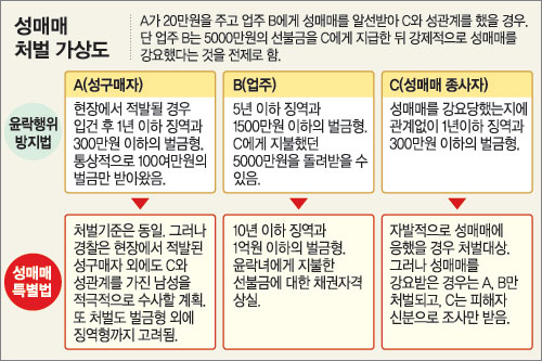 A=자발적으로 성매매를 한 여성은 처벌받는다. 그러나 폭력이나 협박에 의해 성매매를 강요당하거나 마약에 중독된 상태에서 성매매를 했을 경우 피해자로 보호받는다. 반면 성구매자는 무조건 입건 대상이 돼 1년 이하의 징역 또는 300만원 이하 벌금으로 처벌받는다. 기존에는 훈방된 뒤 벌금형을 받았지만 앞으로는 징역형을 받는 경우도 많을 것이다.
