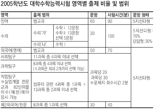 한국교육과정평가원(원장 정강정·鄭剛正)은 8일 이 같은 내용의 ‘2005학년도 수능 시행 계획’을 공고했다.