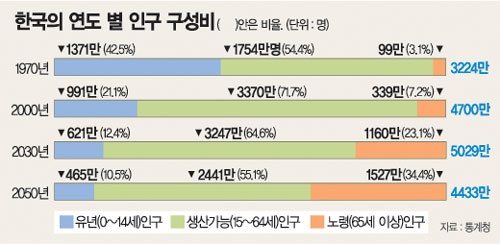 일하는 청장년층은 줄어드는 반면 경제활동에서 ‘은퇴’한 노인층이 많아지면서 △노동인구 비율 감소 △저축률 하락 △재정 악화 등으로 성장 동력에 큰 차질이 예상되는 탓이다.
