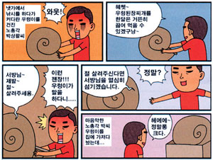심씨는 2층의 공모전 수상작 코너로 발길을 옮겼다. 그는 99년 동아·LG국제만화페스티벌 공모전 극화 부문에 응시했다가 입선(본선 진출)에 그쳤다. 당시 응모작이 ‘파페포포 메모리즈’. 그는 “가장 잘 됐다고 생각한 작품을 내보냈는데 보기 좋게 미역국을 먹었다”며 웃었다.