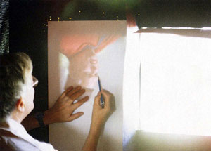 ![]() 카메라 옵스쿠라를 이용해 밑그림을 그리는 모습. 암실에서 역상으로 비쳐진 영상의 윤곽선을 그리는 방법으로 그림의 사실성을 높일 수 있다.- 사진제공 진중권 |