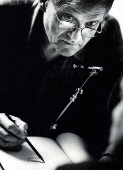 ![]() 영국화가 데이비드 호크니가 카메라 루시다를 이용해 그림 그리는 방법을 실연하고 있다. 카메라 루시다는 화가의 앞에 있는 물체의 영상을 바닥의 종이에 비쳐준다. 이 영상은 카메라 루시다에 장착된 렌즈를 통해서만 볼 수 있기 때문에 옆에 서 있는 사람도 볼 수 없다.- 사진제공 진중권