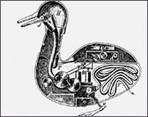 1739년에 자크 드 보캉송이 제작한 오리는 자동기계의 전설이다(그림③). 이 기계오리는 먹고, 마시고, 소화하고, 심지어 배설까지 할 수 있었다고 한다. 물론 당시의 지식수준으로 내장기관을 만들어 소화나 배설과 같은 생화학적 작용까지 시뮬레이션 할 수는 없었다. 나중에 알고 보니 속임수였다. 소화는 가짜였고, 오리의 배설물도 빵 부스러기를 푸른색으로 염색한 것이었다. 보캉송이 하필 배설하는 오리를 만든 이유는 뭘까? 그 자신이 항문질병을 앓고 있었기 때문이란다.