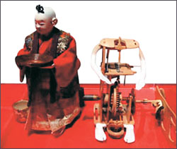 ④일본 에도시대 찻잔을 운반하는 카라쿠리 인형과 나무로 만든 톱니바퀴와 태엽으로 이뤄진 인형의 내부. 태엽장치를 이용해 손님에게 찻잔을 배달하고 다 마신 찻잔을 수거해 온다.