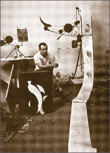 ⑤스위스 조각가 장 탱글리가 기계가 뱉어내는 종이 위에 추상화를 그리도록 만든 자신의 작품 ‘마테마틱’(1959년)의 창작활동을 지켜보고 있다.