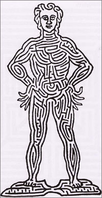 ‘근대적 미로’는 이와 다르다. 여기서는 매번 갈림길에서 길을 선택하도록 강요받는다. 길을 잘못 택해 막다른 골목에 닿기도 하고, 때로는 먼 길을 걸어서 기껏 제 자리로 돌아오기도 한다. 근대적 미로에는 입구와 출구가 따로 존재한다. 그림④는 16세기 이탈리아의 건축가 프란체스코 세갈라가 남긴 작품이다. 머리의 입구로 들어가 사타구니의 출구로 나오려면, 아마 여러 번 시행착오를 겪어야 할 게다. 우리가 어린 시절부터 신문이나 잡지에서 접한 미로 찾기는 모두 근대적 유형의 미로라고 할 수 있다.