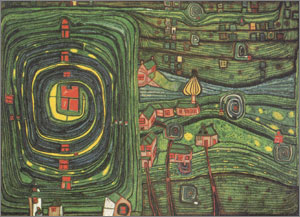 ![]() ⑤오스트리아 화가 프리덴스라이히 훈더트바서의 미로를 이용한 추상화 ‘시골에서 우는 자들을 위한 잔디밭’(1975년). |
