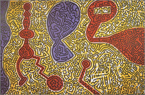 독일의 파울 클레를 비롯해 현대화가들이 종종 작품에 미로를 도입하는 데에는 그럴 만한 이유가 있다. 미로의 형태 자체에 어떤 조형적 아름다움이 있다. 가령 그림⑤를 보자. 오스트리아의 화가 프리덴스라이히 훈더트바서의 작품이다. ‘고전적 미로’의 문양을 그대로 차용해도 이렇게 멋진 추상회화가 된다. 다음 그림⑥을 보자. 미국의 낙서예술가 키스 해링의 작품이다. 어디서 많이 본 것 같지 않은가? 앞에서 살펴 본 프란체스코 세갈라의 미로와 너무나 닮았다. 해링의 미로는 ‘근대적 미로’의 문양을 하고 있다.