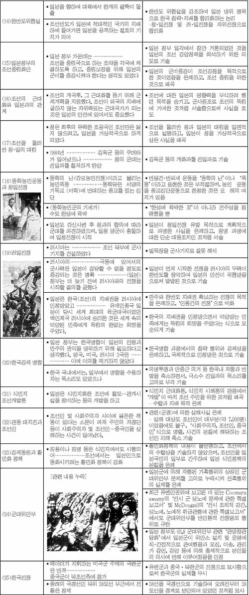 오사카(大阪)서적, 시미즈(淸水)서원측의 교과서는 반봉건, 반외세 운동인 동학농민전쟁을 ‘동학의 난’ ‘폭동’ 등으로, 일본문교출판 교과서는 ‘안중근이 이토를 암살, 일본은 한국을 병합했다’고 각각 기술하고 있다.