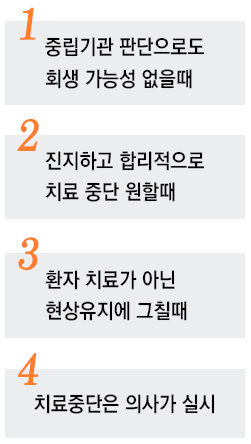 항소심 재판부는 의료계의 요구를 의식한 듯 1심 판결을 인정하면서 연명치료를 중단할 수 있는 4가지의 구체적인 가이드라인을 내놓았다. △환자가 회생 가능성이 없을 때 △환자가 진지하고 합리적으로 치료 중단을 원할 때 △치료 내용이 사망 과정의 연장으로서 현 상태 유지에 관한 것일 때 △의사에 의한 치료 중단의 시행 등이다.