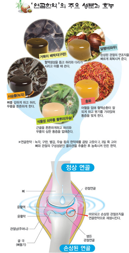 연골한약은 연골과 힘줄, 인대 등 관절조직이 재생되는 데 필요한 콜라겐, 단백질을 공급해 손상된 관절조직을 복원하는 원리다.
