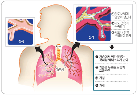 흔히 ‘천명음’으로 불리는 쌕쌕거리는 소리는 천식을 진단하는 대표적인 증상 중 하나. 어린이 천식은 잘만 관리하면 보통 아이처럼 일상생활하는 데 지장이 없지만 조기에 치료되지 않으면 성인 천식으로 진행될 수 있다. 아이가 △밤이나 새벽에 쌕쌕거리는 소리를 내거나 △호흡이 빨라지고 가래가 끓거나 △오랫동안 운동을 하는 데 어려움을 느끼고 답답함을 호소하면 소아청소년과와 호흡기 전문 병원을 찾는 것이 좋다.