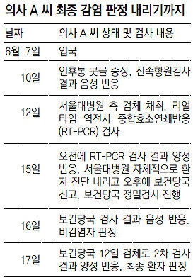 미국 시카고에서 열린 학회에 참가했다 뉴욕을 거쳐 7일 귀국한 A 씨는 10일 오후부터 인후통과 콧물 증상이 나타났다. 서울대병원은 A 씨에 대해 ‘신속항원검사’라는 간이검사를 실시한 결과 음성 판정이 나왔다. 증상이 더 나빠지자 12일 ‘리얼타임 역전사-중합효소연쇄반응(RT-PCR)’이라는 정밀검사를 진행했다. 15일 오전 결과가 나왔으며 양성이었다. 서울대병원은 그제야 보건당국에 신고했다.
