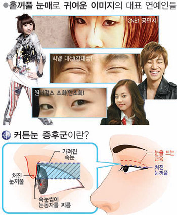이들은 최근 가요계에서 큰 인기를 모으는 아이돌 그룹의 멤버. 귀여운 외모와 화려한 퍼포먼스로 대중의 사랑을 받는 이들의 공통된 매력 포인트는 깜찍한 눈웃음이다. 선하고 귀여운 이미지를 자아내는 눈웃음은 ‘홑꺼풀’ 덕분인 경우가 많다. 하지만 이런 형태의 눈꺼풀은 심하게 처지면 외모나 건강상의 문제를 유발할 수 있다.