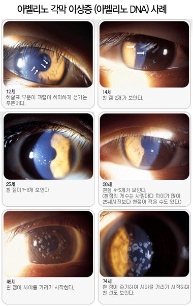 ‘아벨리노 각막 이상증 (아벨리노 DNA검사로 판별)’ 이란? 1988년 이탈리아 아벨리노 지역에서 이주해온 가족에게서 최초 발견되었으며, 각막 속에 ‘하이알린’이라는 점막이 자라 실명에 이르게 하는 유전성 질환으로 알려져 있다.