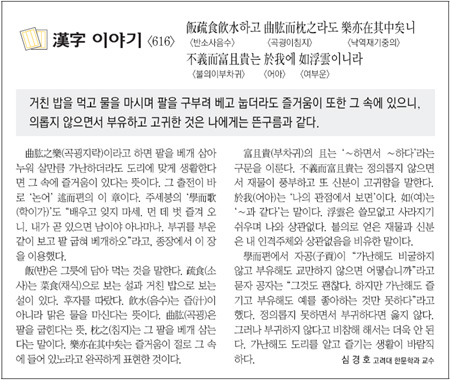 飯(반)은 그릇에 담아 먹는 것을 말한다. 疏食(소사)는 菜食(채식)으로 보는 설과 거친 밥으로 보는 설이 있다. 후자를 따랐다. 飮水(음수)는 즙(汁)이 아니라 맑은 물을 마신다는 뜻이다. 曲肱(곡굉)은 팔을 굽힌다는 뜻, 枕之(침지)는 그 팔을 베개 삼는다는 말이다. 樂亦在其中矣는 즐거움이 절로 그 속에 들어 있노라고 완곡하게 표현한 것이다.