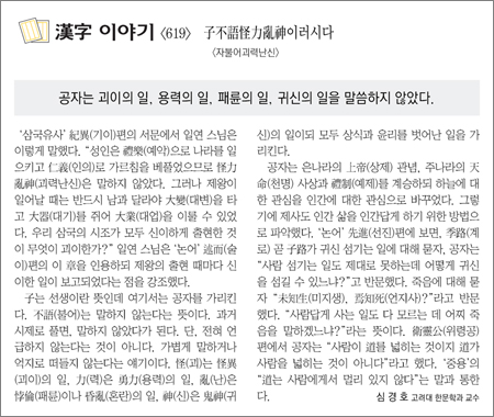 子는 선생이란 뜻인데 여기서는 공자를 가리킨다. 不語(불어)는 말하지 않는다는 뜻이다. 과거 시제로 풀면, 말하지 않았다가 된다. 단, 전혀 언급하지 않는다는 것이 아니다. 가볍게 말하거나 억지로 떠들지 않는다는 얘기이다. 怪(괴)는 怪異(괴이)의 일, 力(력)은 勇力(용력)의 일, 亂(난)은 悖倫(패륜)이나 昏亂(혼란)의 일, 神(신)은 鬼神(귀신)의 일이되 모두 상식과 윤리를 벗어난 일을 가리킨다.