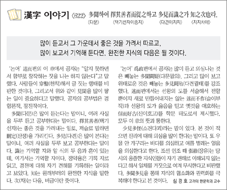 多聞(다문)은 많이 듣는다는 말이니, 여러 사실을 두루 듣고 공부한다는 말이다. 擇其善者(택기선자)는 좋은 것을 가려내는 일로, 저술로 말하면 刪定(산정)을 가리킨다. 多見(다견)은 많이 본다는 말이니, 여러 사실을 두루 보고 공부한다는 말이다. 識는 기억할 지와 알 식의 두 음과 훈이 있는데, 여기서는 기억할 지이다. 정약용은 기록 지로 읽고, 경전에 대해 자기 견해를 기록하는 일이라고 보았다. 知는 원래부터의 완전한 지식을 말한다. 次(차)는 다음, 버금이란 뜻이다.