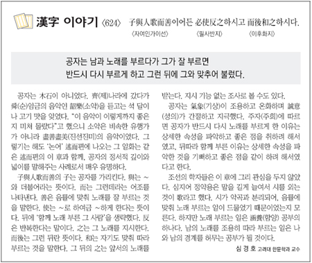 子與人歌而善의 子는 공자를 가리킨다. 與는 ∼와 더불어라는 뜻이다. 而는 그런데라는 어조를 나타낸다. 善은 음률에 맞춰 노래를 잘 부르는 것을 말한다. 使는 ∼로 하여금 ∼하게 한다는 뜻이다. 뒤에 ‘함께 노래 부른 그 사람’을 생략했다. 反은 반복한다는 말이다. 之는 그 노래를 지시한다. 而後는 그런 뒤란 뜻이다. 和는 자기도 맞춰 따라 부르는 것을 말한다. 그 뒤의 之는 앞서의 노래를 받는다. 지시 기능 없는 조사로 볼 수도 있다.