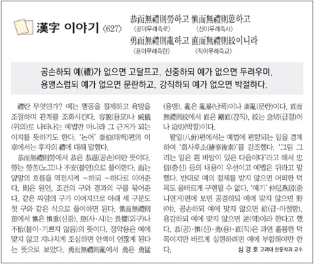 팔일(八佾)편에서는 예법에 편향되는 일을 경계하여 ‘회사후소(繪事後素)’를 강조했다. ‘그림 그리는 일은 흰 바탕이 있은 다음이다’라고 해서 忠信(충신) 등의 내용이 우선이고 예법은 뒤라고 말했다. 반대로 예의 절제를 받지 않으면 어떠한 덕목도 올바르게 구현될 수 없다. ‘예기’ 仲尼燕居(중니연거)편에 보면 공경하되 예에 맞지 않으면 野(야), 공손하되 예에 맞지 않으면 給(급·아첨함), 용감하되 예에 맞지 않으면 逆(역)이라 한다고 했다. 恭(공)·愼(신)·勇(용)·直(직)은 과연 훌륭한 덕목이지만 바르게 실현하려면 예에 부합해야만 한다.