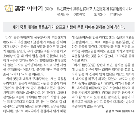 ‘논어’ 泰伯(태백)편에 曾子(증자)가 위독해지자 魯(노)나라 가신 孟敬子(맹경자)가 위문을 간 이야기가 나온다. 증자는 위의 옛말을 끌어온 뒤 그에게 格言을 남겼다. 우리 선인은 죽을 각오를 하고 上疏(상소)할 때 위의 말을 흔히 인용했다. 將은 장차 ∼하려 한다는 뜻이다. 其鳴也哀와 其言也善의 也는 ‘∼으로 말하면’이라는 식으로 어떤 사안을 주제화하는 어조사다. 풀이할 때는 흔히 주격조사 ‘∼가’나 ‘∼이’를 이용한다.