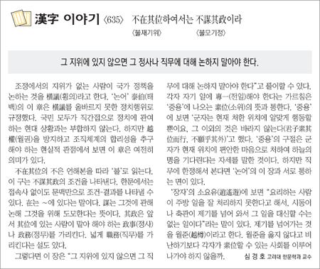 不在其位의 不은 언해본을 따라 ‘불’로 읽는다. 이 구는 不謀其政의 조건을 나타낸다. 한문에서는 접속사 없이도 문맥만으로 조건-결과를 나타낼 수 있다. 在는 ∼에 있다는 말이다. 謀는 그것에 관해 논해 그것을 위해 도모한다는 뜻이다. 其政은 앞서 其位에 있는 사람이 맡아 해야 하는 政事(정사)나 政務(정무)를 가리킨다. 넓게 職務(직무)를 가리킨다는 설도 있다.