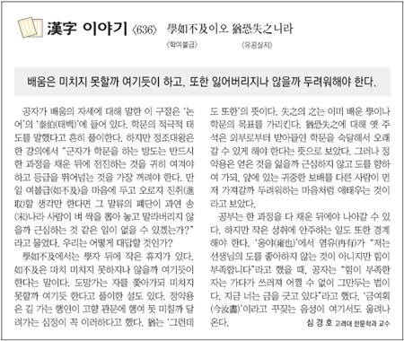 學如不及에서는 學자 뒤에 작은 휴지가 있다. 如不及은 마치 미치지 못하지나 않을까 여기듯이 한다는 말이다. 도망가는 자를 쫓아가되 미치지 못할까 여기듯 한다고 풀이한 설도 있다. 정약용은 길 가는 행인이 고향 관문에 행여 못 미칠까 달려가는 심정이 꼭 이러하다고 했다. 猶는 ‘그런데도 또한’의 뜻이다. 失之의 之는 이미 배운 學이나 학문의 목표를 가리킨다. 猶恐失之에 대해 옛 주석은 외부로부터 받아들인 학문을 숙달해서 오래갈 수 있게 해야 한다는 뜻으로 보았다. 그러나 정약용은 얻은 것을 잃을까 근심하지 않고 도를 향하여 가되, 앞에 있는 귀중한 보배를 다른 사람이 먼저 가져갈까 두려워하는 마음처럼 애태우는 것이라고 보았다.