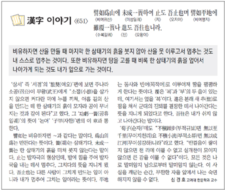 譬如는 비유하자면 ∼과 같다는 말이다. 爲山의 爲는 만든다는 뜻이다. 궤(궤)는 삼태기다. 未成一궤는 한 삼태기의 흙을 미처 붓지 않는다는 말이다. 止는 발자국의 형상인데, 발에 힘을 주어 발자국을 내는 데서 멈추다, 그치다의 뜻을 지니게 됐다. 吾止也는 다른 사람이 그치게 만드는 일이 아니라 내가 멈추어 그치는 일이라는 뜻이다. 平地는 동사와 빈어(목적어)로 이루어져 땅을 평평하게 한다는 뜻이다. 覆은 ‘복’과 ‘부’의 두 음이 있는데, 여기서는 엎을 ‘복’이다. 進은 본래 새 추(추)로 점을 쳐서 군대의 진퇴를 결정한 데서 나아간다는 뜻을 지니게 되었다고 한다. 吾往은 내가 쉬지 않고 나아간다는 말이다.