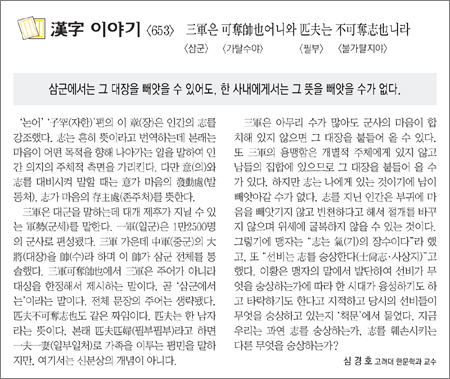 三軍은 대군을 말하는데 대개 제후가 지닐 수 있는 軍勢(군세)를 말한다. 一軍(일군)은 1만2500명의 군사로 편성됐다. 三軍 가운데 中軍(중군)의 大將(대장)을 帥(수)라 하며 이 帥가 삼군 전체를 통솔했다. 三軍可奪帥也에서 三軍은 주어가 아니라 대상을 한정해서 제시하는 말이다. 곧 ‘삼군에서는’이라는 말이다. 전체 문장의 주어는 생략됐다. 匹夫不可奪志也도 같은 짜임이다. 匹夫는 한 남자라는 뜻이다. 본래 匹夫匹婦(필부필부)라고 하면 一夫一妻(일부일처)로 가족을 이루는 평민을 말하지만, 여기서는 신분상의 개념이 아니다.