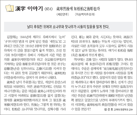 역사에는 志操 있는 사람의 일화가 많다. 한나라 成帝(성제) 때 朱雲(주운)의 折檻(절함) 고사도 한 예이다. 주운은 성제에게 “尙方斬馬劍(상방참마검)을 주시면 간신 한 사람을 참수하여 사람들을 징계하겠습니다”라고 했다. 상방서의 칼은 말을 벨 정도로 예리하다고 해서 참마검이라 했다. 성제가 간신이 누구냐고 묻자 주운은 성제의 인척인 張禹(장우)라고 대답했다. 성제가 노하여 그를 끌어내라고 했지만 주운은 直諫(직간)하면서 御殿(어전)의 난간을 꽉 붙잡고 있었으므로 난간이 부러지기까지 했다. 이 시대에는 歲寒松柏의 典型(전형)을 어디서 찾을 수 있을 것인가?