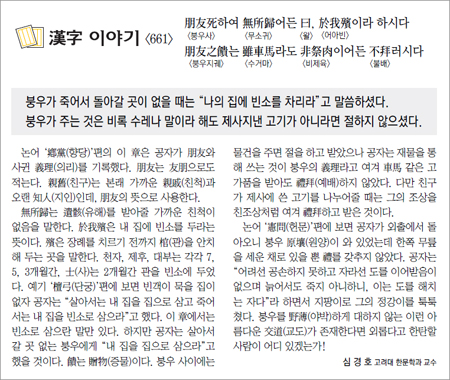 無所歸는 遺骸(유해)를 받아줄 가까운 친척이 없음을 말한다. 於我殯은 내 집에 빈소를 두라는 뜻이다. 殯은 장례를 치르기 전까지 棺(관)을 안치해 두는 곳을 말한다. 천자, 제후, 대부는 각각 7, 5, 3개월간, 士(사)는 2개월간 관을 빈소에 두었다. 예기 ‘檀弓(단궁)’편에 보면 빈객이 묵을 집이 없자 공자는 “살아서는 내 집을 집으로 삼고 죽어서는 내 집을 빈소로 삼으라”고 했다. 이 章에서는 빈소로 삼으란 말만 있다. 하지만 공자는 살아서 갈 곳 없는 붕우에게 “내 집을 집으로 삼으라”고 했을 것이다. 饋는 贈物(증물)이다. 붕우 사이에는 물건을 주면 절을 하고 받았으나 공자는 재물을 통해 쓰는 것이 붕우의 義理라고 여겨 車馬 같은 고가품을 받아도 禮拜(예배)하지 않았다. 다만 친구가 제사에 쓴 고기를 나누어줄 때는 그의 조상을 친조상처럼 여겨 禮拜하고 받은 것이다.