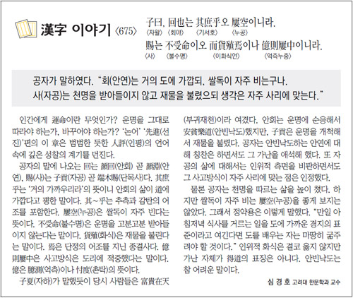 공자의 말에 나오는 回는 顔回(안회) 곧 顔淵(안연), 賜(사)는 子貢(자공) 곧 端木賜(단목사)다. 其庶乎는 ‘거의 가까우리라’의 뜻이니 안회의 삶이 道에 가깝다고 평한 말이다. 其∼乎는 추측과 감탄의 어조를 포함한다. 屢空(누공)은 쌀독이 자주 빈다는 뜻이다. 不受命(불수명)은 운명을 고분고분 받아들이지 않는다는 말이다. 貨殖(화식)은 재물을 불린다는 말이다. 焉은 단정의 어조를 지닌 종결사다. 億則屢中은 사고방식은 도리에 적중했다는 말이다. 億은 臆測(억측)이나 忖度(촌탁)의 뜻이다.