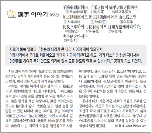 率爾는 ‘예의를 차리지 않고 불쑥’이니, 輕遽(경거)와 坦率(탄솔)의 태도를 나타낸다. 千乘之國은 兵車(병거) 일천 승을 징발할 수 있는 제후의 나라다. 乘은 병거를 세는 수량사다. 攝은 끼어있다는 뜻으로 接(접)과 같다. 大國은 병거 일만 승을 징발할 수 있는 나라다. 師는 2500명, 旅는 500명의 軍團(군단)이다. 加之以師旅는 ‘이웃나라에서 군대로 쳐들어오면’이다. 饑饉은 凶年(흉년)을 뜻한다. 由也의 由는 자로가 이름을 일인칭으로 사용한 것이다. 爲는 治와 같다. 比及은 ‘미치다’로, 比는 及과 같다. 三年을 말한 것은 옛날에는 삼년마다 治積(치적)을 考査(고사)했기 때문이다. 使는 사역동사로, 뒤에 人民이란 말이 생략되었다. 方은 의리에 부합하는 도를 가리킨다. 신은 미소 짓는다는 말이다.
