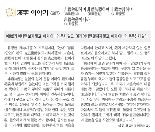 非禮勿視는 눈앞의 일이 선왕 이래의 禮法이나 禮義에 부합하지 않는다면 너는 그것을 보지 말라는 뜻이다. 非禮의 주어와 勿視의 주어가 다른데도 둘이 모두 생략되어 이어진 긴축복합문이다. 아래 세 구절도 같다. 같은 글자 수, 같은 구조, 같은 범주의 문장을 셋 이상 늘어놓는 것을 類句法(유구법)이나 累層法(누층법)이라 한다. 視는 見과 다르고, 聽은 聞과 다르다. 보려고 해서 보는 것이 視, 들으려고 해서 듣는 것이 聽이다. 공자는 私欲을 이기려면 視聽言動을 主宰(주재)하는 마음을 다잡아야 한다고 보아, 禮에 부합하지 않는 일은 보려고도 들으려고도 하지 말고 말하려고도 행하려고도 하지 말라고 했다.