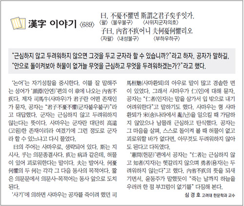 曰의 주어는 사마우로, 생략되어 있다. 斯는 지시사, 乎는 의문종결사다. 구는 病과 같은데, 허물이 있어 괴로워한다는 말이다. 夫는 발어사. 何憂何懼의 두 何는 각각 그 다음 동사의 목적어다. 짧은 의문문에서 의문사-목적어는 동사 앞으로 도치된다.