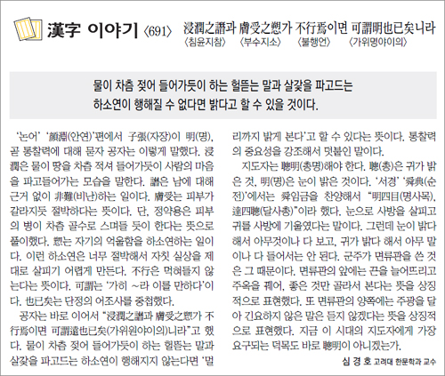 공자는 바로 이어서 “浸潤之참과 膚受之(색,소)가 不行焉이면 可謂遠也已矣(가위원야이의)니라”고 했다. 물이 차츰 젖어 들어가듯이 하는 헐뜯는 말과 살갗을 파고드는 하소연이 행해지지 않는다면 ‘멀리까지 밝게 본다’고 할 수 있다는 뜻이다. 통찰력의 중요성을 강조해서 덧붙인 말이다.