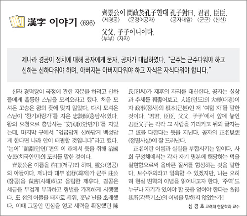 齊景公은 이름을 杵臼(저구)라 하며, 靈公(영공)의 아들이다. 제나라 대부 崔저(최저)가 군주 莊公(장공)을 弑害(시해)하고 옹립한 제후다. 경공은 세금을 무겁게 부과하고 형벌을 가혹하게 시행했다. 또 첩의 아들을 태자로 세워, 훗날 난을 초래했다. 이때 그동안 민심을 얻고 세력을 확장했던 陳氏(진씨)가 제후의 자리를 대신한다. 공자는 실상과 추세를 꿰뚫어보고, 人道(인도)의 大經(대경)이자 政事(정사)의 根本(근본)인 저 ‘여덟 자’를 말한 것이다. ‘君君, 臣臣, 父父, 子子’에서 앞에 놓인 君臣父子는 각각 그 사람을 가리키고 뒤의 글자는 그 道를 다한다는 뜻을 지닌다. 공자의 正名思想(정명사상)이 잘 드러난다.