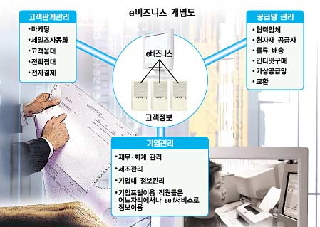 2000년 이후 ‘인터넷시대’의 통합은 ‘기업간 통합’을 의미한다. ERP를 바탕으로 고객관계관리(CRM) 공급망관리(SCM) 등이 통합돼야 한다. 고객정보관리 주문처리 AS 등과 원자재 업체와의 B2B전자상거래 재고관리 물류관리 등이 연동되도록 하는 것이다.