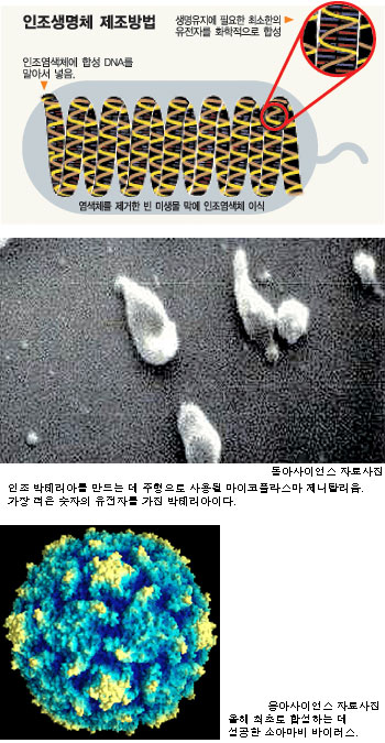 인조 박테리아의 주형이 될 모델은 마이코플라스마 제니탈리움. 사람의 생식기나 폐에서 흔히 발견되는 이 박테리아는 생명체 가운데 유전자의 숫자가 가장 적다. 유전자의 숫자는 517개. 하지만 이 중에서 265∼350개의 유전자만이 생명을 유지하는 데 필수불가결한 유전자이다.