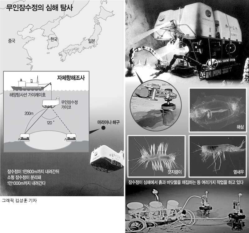 잠수정은 2시간에 걸쳐 1만800m까지 탐사선에서 쇠줄에 매달려 내려간다. 이어 작은 잠수정이 다시 줄에 매달려 1시간 동안 1만1000m의 해저까지 내려간다. 잠수정에는 로봇팔이 달려 있어 그물이나 먹이통으로 생물과 흙을 채취한다. 잠수정은 심해에 도달해 기껏 1시간 남짓 활동할 수 있다. 가이코 잠수정은 이번 탐사에 7, 8차례 마리아나 해구에 잠수했다.