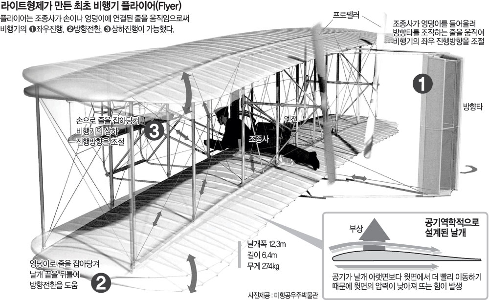 ▽비행기는 자전거처럼=워싱턴 중심가의 항공우주박물관에는 라이트형제의 플라이어 실물이 그들이 만들었던 자전거와 나란히 전시돼 있다. 자전거 제작자였던 라이트형제는 비행기를 기우뚱거리는 자전거처럼 계속 균형을 잡아야 하고 몸을 기울여 비행방향을 바꿔야 한다고 생각했다. 비행기를 자동차처럼 별 기울임 없이 회전하는 것으로 여겼던 이전 사람들과 다른 발상이었다.