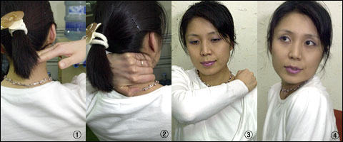 ②손으로 목 뒤쪽 근육을 잡았다가 놓는 동작을 되풀이한다.