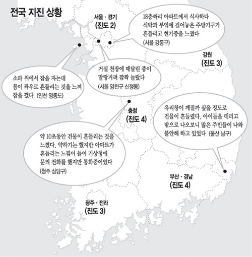 ▽기타 지역=광주와 전남지역에서도 이날 오전 형광등과 창문틀이 심하게 흔들렸다.