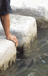 “흔한 징검다리 돌 같지만 아래쪽은 물살을 견딜 수 있도록 넓은 모양으로, 중간은 흐름을 방해하지 않게 가운데가 들어가야 하죠. 또 물이 오는 방향은 어느 정도 모가 나서 물살을 헤치게 해야 하고 그러면서도 윗부분은 평평해야 하니까요. 꼭 장구 같은 모양이어야 하는데 그런 돌이 어디 흔한가요. ‘깎으면 되지 않느냐’고 묻는 사람도 있지만 돌을 가공하는 데는 돈이 엄청나게 들어가거든요.”