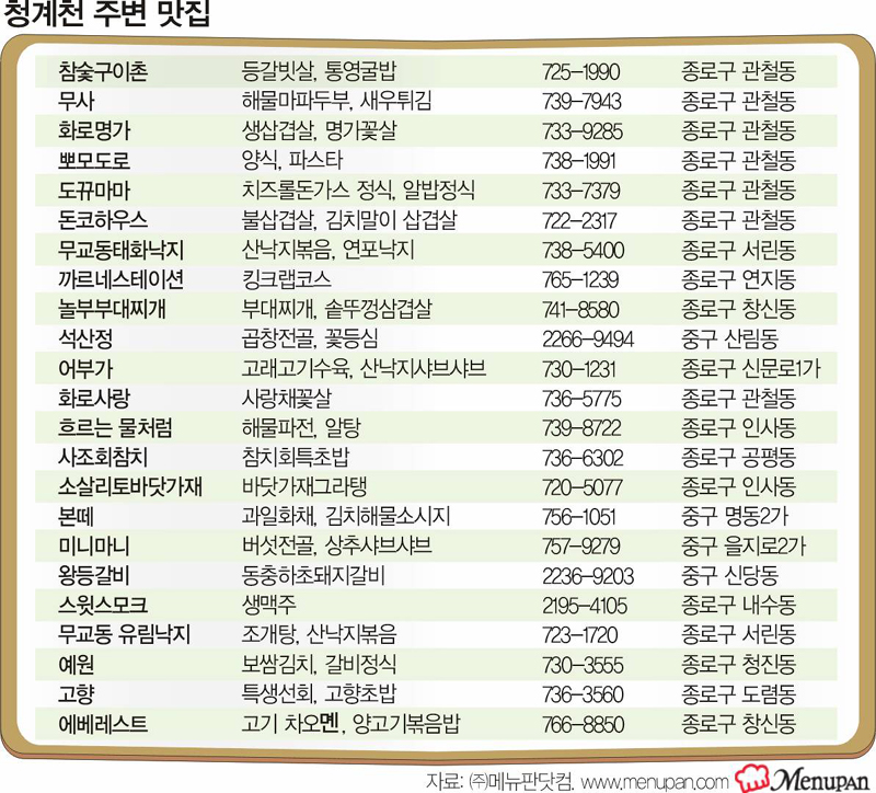 어느 곳 하나 빼놓을 곳이 없지만 그중에서도 ‘청계 8경’만큼은 과거와 현대가 공존하는 꼭 봐야만 할 명소. 거기서 푸르디 푸른 가을을 받으며 청계천에 발을 담그고 사랑과 우정과 인생을 이야기해 보자.