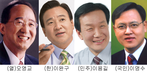 충남도지사 선거는 열린우리당 오영교, 한나라당 이완구, 국민중심당 이명수, 민주노동당 이용길 후보가 뛰고 있다. 한나라당 이 후보가 지지율 1위를 달리고 우리당 오 후보가 추격하는 양상이다.